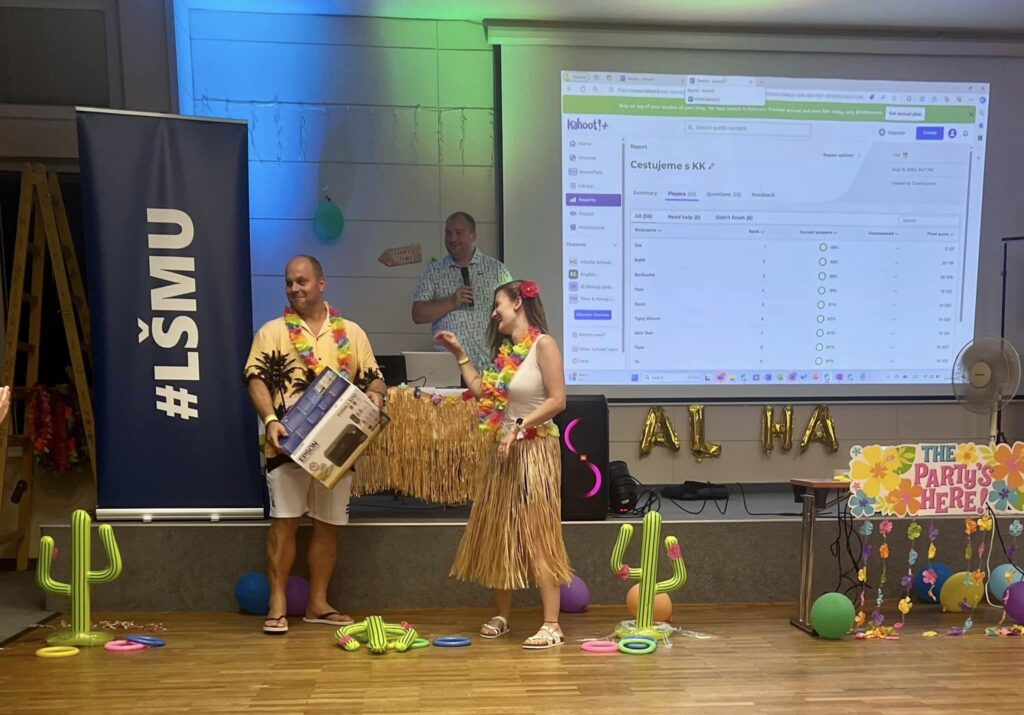 Týden jsme v pátek dopoledne zakončili přednáškami o efektivní práci s daty nebo školním rezervačním systému, ale zejména o využití her a různých herních prostředí ve vyučovacím procesu. Téma závěrečného galavečera – Hawai party – bylo vzhledem k přetrvávajícímu horku opravdu příhodné, a tak k doplnění ostrovní iluze chybělo už opravdu jen to moře, protože o nápadité kostýmy, zábavu, tanec a dobré pití nouze opravdu nebyla.